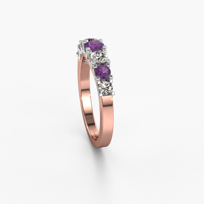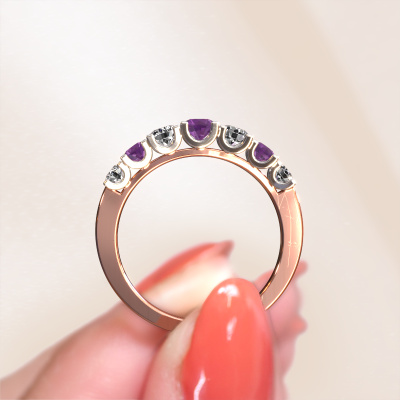 This extraordinary ring is called Selina 3. This type of ring is known as a memoire ring, because its gemstones are set in a continuous line. This makes it easy to combine with other rings. The band of this 14 Carat rose gold ring is set in a combination of amethyst and diamond 3.7 mm. You can easily choose the combination you prefer online. As you can see, a single amethyst is set in this single alliance rose gold ring. The memoire ring represents collaboration. And that is precisely what these gemstones do, collaborate. Together they add a beautiful effect to the band of a modern ring! Such a meaningful ring, wouldn't you agree? All of our hand selected amethysten are positioned by hand by our expert goldsmith. It's a precise task, which can only be completed successfully through the combination of pure craftsmanship and usage of the latest techniques which give it an optimal effect. To create a perfect reflection of light, all the gemstones have to be perfectly aligned in the same way. During manufacturing, the expert goldsmith will therefore monitor the reflection of light constantly to check whether the amethysten are aligned properly. This requires a skilled hand and a lot of patience but then the end product will be a true piece of art. And that is our mission!Because we design and deliver our own rings, we can offer you a ring at a price you won't find anywhere else. A ring is made to order, which helps prevent excess supplies, so we can make you a great price offer. We understand it feels risky, buying your ring online, but we will gladly assist in the designing process, taking your budget into consideration.Our team of talented, passionate designers add new ring designs to our online collection daily. Our objective in doing so, is to be able to offer you a wide variety of jewels. Please feel free to request a quote if you have specific wishes for your ring. We guarantee to make you an offer you can't refuse.To make it easier for you, we offer a 30 day return policy. Check our terms and conditions.