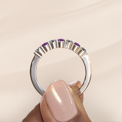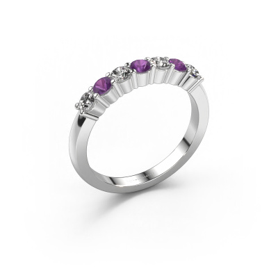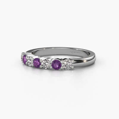 This extraordinary ring is called Yasmin 7. This type of ring is known as a memoire ring, because its gemstones are set in a continuous line. This makes it easy to combine with other rings. The band of this 14 Carat white gold ring is set in a combination of amethyst and lab-grown diamond 2.7 mm. You can easily choose the combination you prefer online. As you can see, a single amethyst is set in this single alliance white gold ring. The memoire ring represents collaboration. And that is precisely what these gemstones do, collaborate. Together they add a beautiful effect to the band of a classic ring! Such a meaningful ring, wouldn't you agree? All of our hand selected amethysten are positioned by hand by our expert goldsmith. It's a precise task, which can only be completed successfully through the combination of pure craftsmanship and usage of the latest techniques which give it an optimal effect. To create a perfect reflection of light, all the gemstones have to be perfectly aligned in the same way. During manufacturing, the expert goldsmith will therefore monitor the reflection of light constantly to check whether the amethysten are aligned properly. This requires a skilled hand and a lot of patience but then the end product will be a true piece of art. And that is our mission!After receiving your order, our goldsmiths will passionately start the creative process of making your ring in our own studio. Because we don't have a big stockpile, these costs will not be passed on to you. Our pricing is proof of that! We offer top quality jewels at lowest price, guaranteed.Our team of talented, passionate designers add new ring designs to our online collection daily. Our objective in doing so, is to be able to offer you a wide variety of jewels. Please feel free to request a quote if you have specific wishes for your ring. We guarantee to make you an offer you can't refuse.To make it easier for you, we offer a 30 day return policy. Check our terms and conditions.