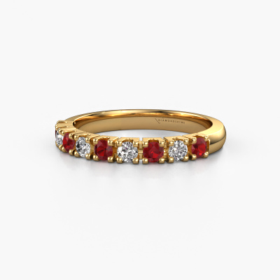 This extraordinary ring is called Rianne 9. This type of ring is known as a memoire ring, because its gemstones are set in a continuous line. This makes it easy to combine with other rings. The band of this 14 Carat gold ring is set in a combination of ruby and diamond 2.4 mm. You can easily choose the combination you prefer online. As you can see, a single ruby is set in this single alliance gold ring. The memoire ring represents collaboration. And that is precisely what these gemstones do, collaborate. Together they add a beautiful effect to the band of a classic ring! Such a meaningful ring, wouldn't you agree? All of our hand selected ruby are positioned by hand by our expert goldsmith. It's a precise task, which can only be completed successfully through the combination of pure craftsmanship and usage of the latest techniques which give it an optimal effect. To create a perfect reflection of light, all the gemstones have to be perfectly aligned in the same way. During manufacturing, the expert goldsmith will therefore monitor the reflection of light constantly to check whether the ruby are aligned properly. This requires a skilled hand and a lot of patience but then the end product will be a true piece of art. And that is our mission!Are you on a budget? Please feel free to contact us, so we can go discuss your options. We offer our rings at guaranteed best price, because we make them to order. You won't find such a price anywhere else!