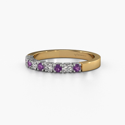 This extraordinary ring is called Dana 9. This type of ring is known as a memoire ring, because its gemstones are set in a continuous line. This makes it easy to combine with other rings. The band of this 14 Carat gold ring is set in a combination of amethyst and diamond 2 mm. You can easily choose the combination you prefer online. As you can see, a single amethyst is set in this single alliance gold ring. The memoire ring represents collaboration. And that is precisely what these gemstones do, collaborate. Together they add a beautiful effect to the band of a modern ring! Such a meaningful ring, wouldn't you agree? All of our hand selected amethysten are positioned by hand by our expert goldsmith. It's a precise task, which can only be completed successfully through the combination of pure craftsmanship and usage of the latest techniques which give it an optimal effect. To create a perfect reflection of light, all the gemstones have to be perfectly aligned in the same way. During manufacturing, the expert goldsmith will therefore monitor the reflection of light constantly to check whether the amethysten are aligned properly. This requires a skilled hand and a lot of patience but then the end product will be a true piece of art. And that is our mission!After receiving your order, our goldsmiths will passionately start the creative process of making your ring in our own studio. Because we don't have a big stockpile, these costs will not be passed on to you. Our pricing is proof of that! We offer top quality jewels at lowest price, guaranteed.Our talented designers add new designs to our online collection daily. Together they create a diverse collection of the finest jewelry. If you prefer to make a ring according your own design, please feel free to request a quote. We will make you an amazing offer, based on quality and price.To make it easier for you, we offer a 30 day return policy. Check our terms and conditions.