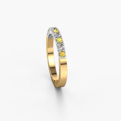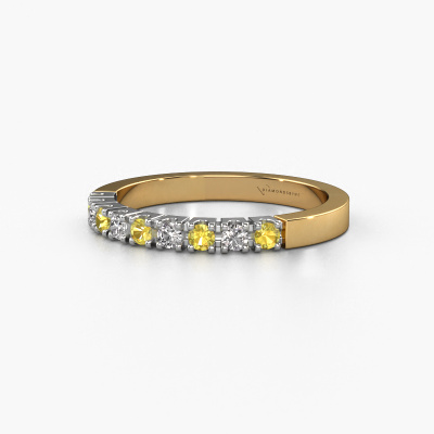This extraordinary ring is called Dana 9. This type of ring is known as a memoire ring, because its gemstones are set in a continuous line. This makes it easy to combine with other rings. The band of this 14 Carat gold ring is set in a combination of yellow sapphire and diamond 2 mm. You can easily choose the combination you prefer online. As you can see, a single yellow sapphire is set in this single alliance gold ring. The memoire ring represents collaboration. And that is precisely what these gemstones do, collaborate. Together they add a beautiful effect to the band of a modern ring! Such a meaningful ring, wouldn't you agree? All of our hand selected yellow sapphire are positioned by hand by our expert goldsmith. It's a precise task, which can only be completed successfully through the combination of pure craftsmanship and usage of the latest techniques which give it an optimal effect. To create a perfect reflection of light, all the gemstones have to be perfectly aligned in the same way. During manufacturing, the expert goldsmith will therefore monitor the reflection of light constantly to check whether the yellow sapphire are aligned properly. This requires a skilled hand and a lot of patience but then the end product will be a true piece of art. And that is our mission!After receiving your order, our goldsmiths will passionately start the creative process of making your ring in our own studio. Because we don't have a big stockpile, these costs will not be passed on to you. Our pricing is proof of that! We offer top quality jewels at lowest price, guaranteed.Our talented designers add new designs to our online collection daily. Together they create a diverse collection of the finest jewelry. If you prefer to make a ring according your own design, please feel free to request a quote. We will make you an amazing offer, based on quality and price.To make it easier for you, we offer a 30 day return policy. Check our terms and conditions.