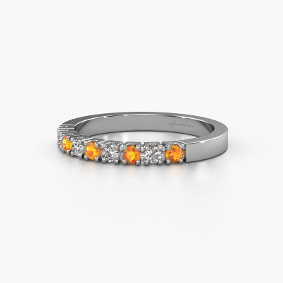 This extraordinary ring is called Dana 9. This type of ring is known as a memoire ring, because its gemstones are set in a continuous line. This makes it easy to combine with other rings. The band of this platinum ring is set in a combination of citrin and diamond 2 mm. You can easily choose the combination you prefer online. As you can see, a single citrin is set in this single alliance platinum ring. The memoire ring represents collaboration. And that is precisely what these gemstones do, collaborate. Together they add a beautiful effect to the band of a modern ring! Such a meaningful ring, wouldn't you agree? All of our hand selected citrin are positioned by hand by our expert goldsmith. It's a precise task, which can only be completed successfully through the combination of pure craftsmanship and usage of the latest techniques which give it an optimal effect. To create a perfect reflection of light, all the gemstones have to be perfectly aligned in the same way. During manufacturing, the expert goldsmith will therefore monitor the reflection of light constantly to check whether the citrin are aligned properly. This requires a skilled hand and a lot of patience but then the end product will be a true piece of art. And that is our mission!After receiving your order, our goldsmiths will passionately start the creative process of making your ring in our own studio. Because we don't have a big stockpile, these costs will not be passed on to you. Our pricing is proof of that! We offer top quality jewels at lowest price, guaranteed.Our talented designers add new designs to our online collection daily. Together they create a diverse collection of the finest jewelry. If you prefer to make a ring according your own design, please feel free to request a quote. We will make you an amazing offer, based on quality and price.To make it easier for you, we offer a 30 day return policy. Check our terms and conditions.