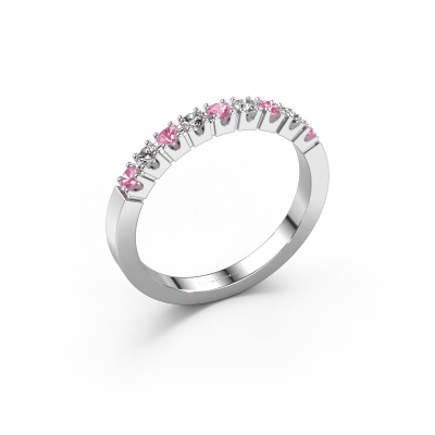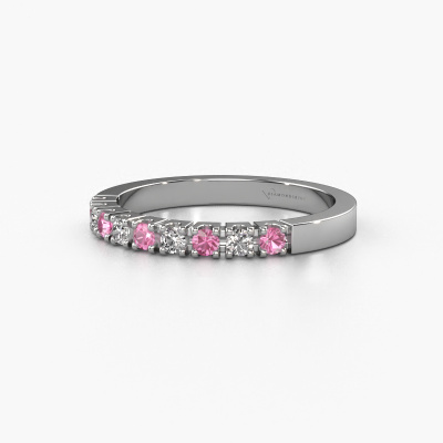 This extraordinary ring is called Dana 9. This type of ring is known as a memoire ring, because its gemstones are set in a continuous line. This makes it easy to combine with other rings. The band of this platinum ring is set in a combination of pink sapphire and diamond 2 mm. You can easily choose the combination you prefer online. As you can see, a single pink sapphire is set in this single alliance platinum ring. The memoire ring represents collaboration. And that is precisely what these gemstones do, collaborate. Together they add a beautiful effect to the band of a modern ring! Such a meaningful ring, wouldn't you agree? All of our hand selected pink sapphire are positioned by hand by our expert goldsmith. It's a precise task, which can only be completed successfully through the combination of pure craftsmanship and usage of the latest techniques which give it an optimal effect. To create a perfect reflection of light, all the gemstones have to be perfectly aligned in the same way. During manufacturing, the expert goldsmith will therefore monitor the reflection of light constantly to check whether the pink sapphire are aligned properly. This requires a skilled hand and a lot of patience but then the end product will be a true piece of art. And that is our mission!After receiving your order, our goldsmiths will passionately start the creative process of making your ring in our own studio. Because we don't have a big stockpile, these costs will not be passed on to you. Our pricing is proof of that! We offer top quality jewels at lowest price, guaranteed.Our talented designers add new designs to our online collection daily. Together they create a diverse collection of the finest jewelry. If you prefer to make a ring according your own design, please feel free to request a quote. We will make you an amazing offer, based on quality and price.To make it easier for you, we offer a 30 day return policy. Check our terms and conditions.