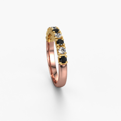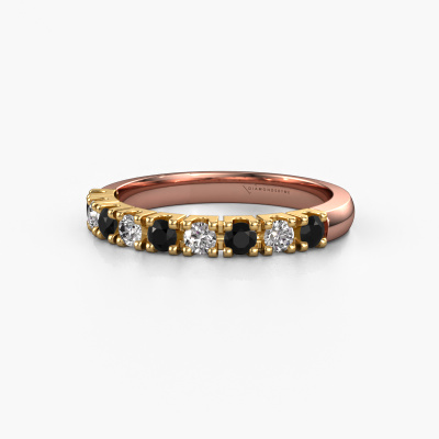 This extraordinary ring is called Rianne 9. This type of ring is known as a memoire ring, because its gemstones are set in a continuous line. This makes it easy to combine with other rings. The band of this 14 Carat rose gold ring is set in a combination of black diamond and diamond 0.55 crt. You can easily choose the combination you prefer online. As you can see, a single black diamond is set in this single alliance rose gold ring. The memoire ring represents collaboration. And that is precisely what these gemstones do, collaborate. Together they add a beautiful effect to the band of a classic ring! Such a meaningful ring, wouldn't you agree? All of our hand selected black diamonds are positioned by hand by our expert goldsmith. It's a precise task, which can only be completed successfully through the combination of pure craftsmanship and usage of the latest techniques which give it an optimal effect. To create a perfect reflection of light, all the gemstones have to be perfectly aligned in the same way. During manufacturing, the expert goldsmith will therefore monitor the reflection of light constantly to check whether the black diamonds are aligned properly. This requires a skilled hand and a lot of patience but then the end product will be a true piece of art. And that is our mission!Are you on a budget? Please feel free to contact us, so we can go discuss your options. We offer our rings at guaranteed best price, because we make them to order. You won't find such a price anywhere else!