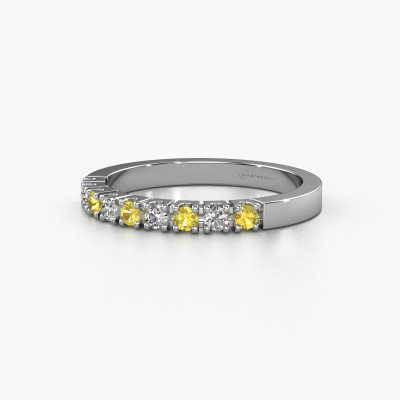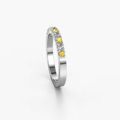 This extraordinary ring is called Dana 9. This type of ring is known as a memoire ring, because its gemstones are set in a continuous line. This makes it easy to combine with other rings. The band of this 14 Carat white gold ring is set in a combination of yellow sapphire and diamond 2 mm. You can easily choose the combination you prefer online. As you can see, a single yellow sapphire is set in this single alliance white gold ring. The memoire ring represents collaboration. And that is precisely what these gemstones do, collaborate. Together they add a beautiful effect to the band of a modern ring! Such a meaningful ring, wouldn't you agree? All of our hand selected yellow sapphire are positioned by hand by our expert goldsmith. It's a precise task, which can only be completed successfully through the combination of pure craftsmanship and usage of the latest techniques which give it an optimal effect. To create a perfect reflection of light, all the gemstones have to be perfectly aligned in the same way. During manufacturing, the expert goldsmith will therefore monitor the reflection of light constantly to check whether the yellow sapphire are aligned properly. This requires a skilled hand and a lot of patience but then the end product will be a true piece of art. And that is our mission!After receiving your order, our goldsmiths will passionately start the creative process of making your ring in our own studio. Because we don't have a big stockpile, these costs will not be passed on to you. Our pricing is proof of that! We offer top quality jewels at lowest price, guaranteed.Our talented designers add new designs to our online collection daily. Together they create a diverse collection of the finest jewelry. If you prefer to make a ring according your own design, please feel free to request a quote. We will make you an amazing offer, based on quality and price.To make it easier for you, we offer a 30 day return policy. Check our terms and conditions.