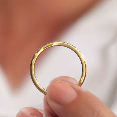 This SR20A2H ring in 14 Carat gold is set with diamond. This gold stacked SR20A2H ring is the perfect addition to your ring collection! As the name suggests, it is a ring which can be combined on one finger with another ring. It gives you the opportunity to create your own style. A stacked ring usually represents a certain memory of someone special or a memorable moment. It is common to combine a stacked ring, representing an anniversary, with a wedding ring. But this affordable ring, combined with your other rings, also makes a classy fashion item. The best part of this affordable ring is that you can customize it to your own liking. Your style, your choice, your ring. On top of that, your modern gold ring will be made by hand with eco-friendly materials! Please feel free to easily customize the ring, using our online tool.Are you on a budget? Please feel free to contact us, so we can go discuss your options. We offer our rings at guaranteed best price, because we make them to order. You won't find such a price anywhere else!To make it easier for you, we offer a 30 day return policy. Check our terms and conditions.