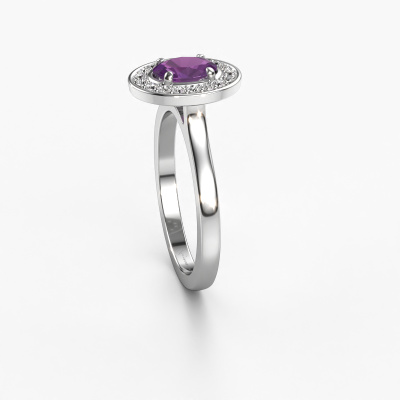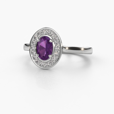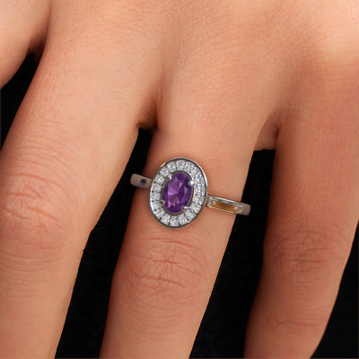 The ring shown above is called Madelon 1. This type of ring is known as a solitaire ring. The platinum ring is set with a 7x5 mm oval amethyst center stone surrounded by smaller sized diamonds. This best price platinum halo ring, is set with a big amethyst embraced by smaller sized gemstones. The ring got its name for its halo which the smaller sized diamonds help create. In order to achieve a stunning halo, these smaller sized gemstones have to be aligned perfectly so light reflects evenly on the amethyst from every angle. And our expert goldsmiths get the job done. Each carefully selected amethyst is set by hand with utmost precision. During manufacturing, light fall is constantly monitored to make sure the special halo effect is still visible. In the end you get a unique ring with a radiant amethyst gemstone centerpiece. An exquisite ring indeed! The best part of this best price ring is that you can customize it to your own liking. Your style, your choice, your ring. On top of that, your classic platinum ring will be made by hand with eco-friendly materials! Please feel free to easily customize the ring, using our online tool.Are you on a budget? Please feel free to contact us, so we can go discuss your options. We offer our rings at guaranteed best price, because we make them to order. You won't find such a price anywhere else!To make it easier for you, we offer a 30 day return policy. Check our terms and conditions.