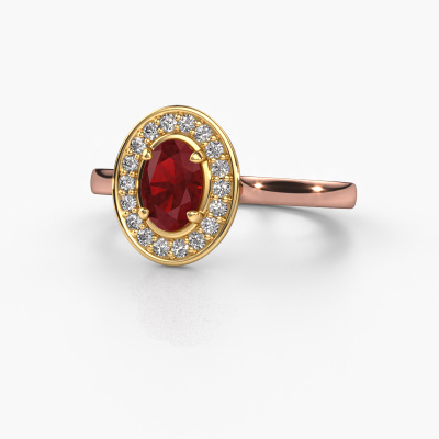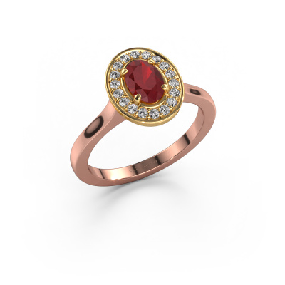 The ring shown above is called Madelon 1. This type of ring is known as a solitaire ring. The 14 Carat rose gold ring is set with a 7x5 mm oval ruby center stone surrounded by smaller sized diamonds. This best price rose gold halo ring, is set with a big ruby embraced by smaller sized gemstones. The ring got its name for its halo which the smaller sized diamonds help create. In order to achieve a stunning halo, these smaller sized gemstones have to be aligned perfectly so light reflects evenly on the ruby from every angle. And our expert goldsmiths get the job done. Each carefully selected ruby is set by hand with utmost precision. During manufacturing, light fall is constantly monitored to make sure the special halo effect is still visible. In the end you get a unique ring with a radiant ruby gemstone centerpiece. An exquisite ring indeed! The best part of this best price ring is that you can customize it to your own liking. Your style, your choice, your ring. On top of that, your classic rose gold ring will be made by hand with eco-friendly materials! Please feel free to easily customize the ring, using our online tool.Are you on a budget? Please feel free to contact us, so we can go discuss your options. We offer our rings at guaranteed best price, because we make them to order. You won't find such a price anywhere else!To make it easier for you, we offer a 30 day return policy. Check our terms and conditions.