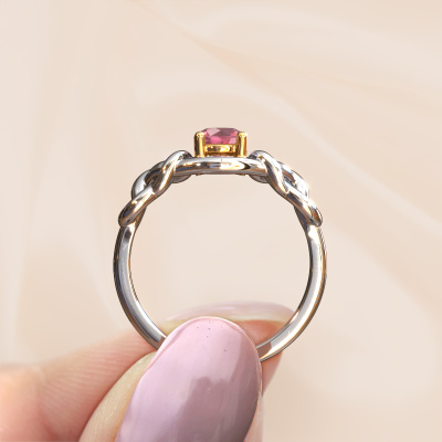 This symbolic white gold Zoe ring is set with tourmaline pink. For some, a ring is nothing more than a beautiful fashion item but they can become a meaningful keepsake. A ring such as this can be worn daily and it matches numerous different styles. Designing your own unique ring, makes it even more special. You are reminded of its uniqueness every time you look at it. Perhaps it reminds you of someone special. It might bring back memories. Unforgettable moments, represented in one ring. The beauty of it all is that the used precious metals and gemstones will last a lifetime. A lifetime of memories deserves nothing less! The best part of this knot ring is that you can customize it to your own liking. Your style, your choice, your ring. On top of that, your Celtic white gold ring will be made by hand with eco-friendly materials! Please feel free to easily customize the ring, using our online tool.By using our modern techniques, we can design and customize the finest quality jewels with the utmost care for you. Our rings are always priced 30 percent lower than other jewelers. We make rings to order, so we don't have to maintain a large stock. If you have a certain budget, we are more than happy to advice you accordingly.To make it easier for you, we offer a 30 day return policy. Check our terms and conditions.