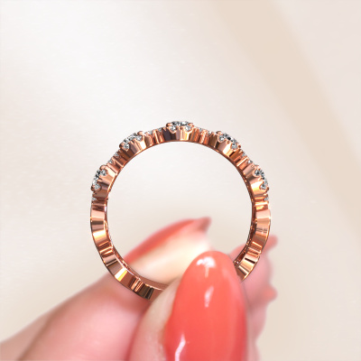 This Tanisha ring in 14 Carat rose gold is set with lab-grown diamond. This rose gold stacked Tanisha ring is the perfect addition to your ring collection! As the name suggests, it is a ring which can be combined on one finger with another ring. It gives you the opportunity to create your own style. A stacked ring usually represents a certain memory of someone special or a memorable moment. It is common to combine a stacked ring, representing an anniversary, with a wedding ring. But this graceful ring, combined with your other rings, also makes a classy fashion item. The best part of this graceful ring is that you can customize it to your own liking. Your style, your choice, your ring. On top of that, your classic rose gold ring will be made by hand with eco-friendly materials! Please feel free to easily customize the ring, using our online tool.By using a combination of the latest modern techniques, combined with ancient crafting, we can make all our rings in our own studio. Each jewel is made to order. This is advantageous because we can offer you a price you won't find anywhere else.To make it easier for you, we offer a 30 day return policy. Check our terms and conditions.