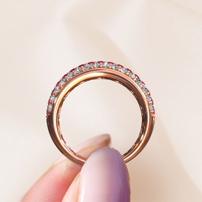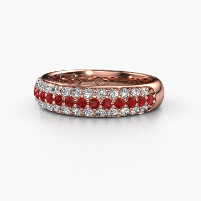 This pave set ring is called Emely 6. This 14 Carat rose gold ring is set with ruby 1.7 mm. The band of this rose gold ring is set with rows of ruby which seem to have no beginning nor end. Our goldsmith carefully selects the gemstones and sets them with the utmost precision. For maximum shine, the ruby have to align perfectly. While artfully crafting and polishing the jewelry, light fall is constantly monitored, until the expert goldsmith is satisfied with the result. Designed by you, created especially for you!Customize your own edgyEmely 6 ring, which will then be created by our goldsmiths with great passion. Do you prefer a different option than is shown here in the rose gold Emely 6 ring? Then our online tools offers various options. Feel free to ask us for help if you are unable to succeed. We are happy to answer your questions!After receiving your order, our goldsmiths will passionately start the creative process of making your ring in our own studio. Because we don't have a big stockpile, these costs will not be passed on to you. Our pricing is proof of that! We offer top quality jewels at lowest price, guaranteed.To make it easier for you, we offer a 30 day return policy. Check our terms and conditions.