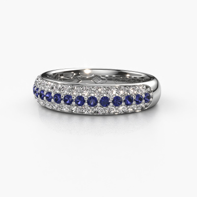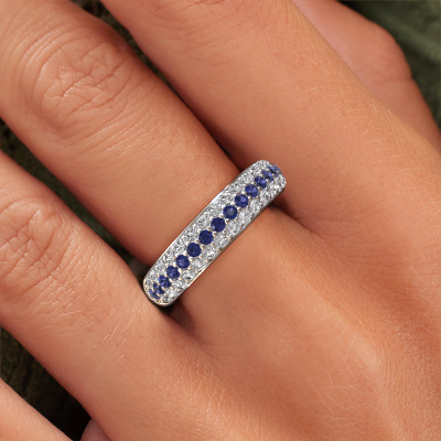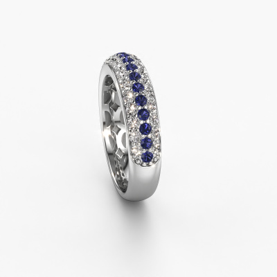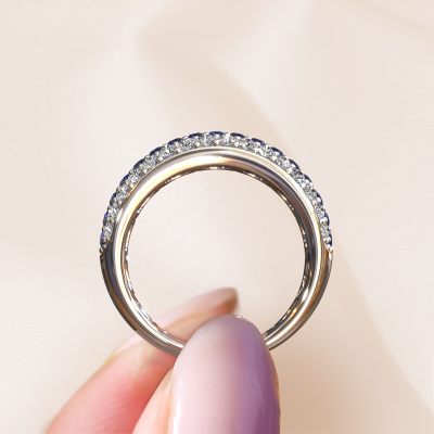 This pave set ring is called Emely 6. This platinum ring is set with sapphire 1.7 mm. The band of this platinum ring is set with rows of sapphire which seem to have no beginning nor end. Our goldsmith carefully selects the gemstones and sets them with the utmost precision. For maximum shine, the sapphire have to align perfectly. While artfully crafting and polishing the jewelry, light fall is constantly monitored, until the expert goldsmith is satisfied with the result. Designed by you, created especially for you!Customize your own edgyEmely 6 ring, which will then be created by our goldsmiths with great passion. Do you prefer a different option than is shown here in the platinum Emely 6 ring? Then our online tools offers various options. Feel free to ask us for help if you are unable to succeed. We are happy to answer your questions!After receiving your order, our goldsmiths will passionately start the creative process of making your ring in our own studio. Because we don't have a big stockpile, these costs will not be passed on to you. Our pricing is proof of that! We offer top quality jewels at lowest price, guaranteed.To make it easier for you, we offer a 30 day return policy. Check our terms and conditions.