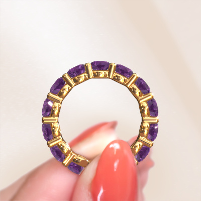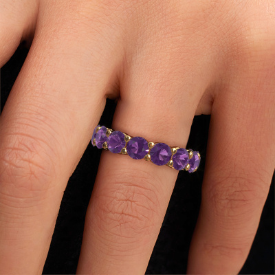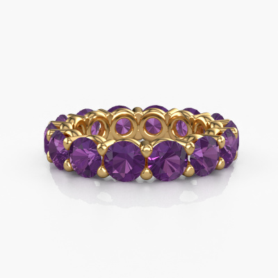 This is our Heddy rnd 4.7 ring. This specific type is called an eternity ring and it is set with a continuous line of identically cut gemstones. The ring is made in 14 Carat gold and is set with small amethysten, 4.7 mm. This gold Eternity ring is a perfectly beautiful and meaningful way to give your proposal that special touch. The magnificent evenly shaped amethysten are pave set around the ring. The identical amethysten are carefully selected to give the ring a maximum effect. Do keep in mind we use natural resources so small differences between stones are common. The special effect is enhanced due to precise positioning of the amethysten. This requires the utmost precision and a skillful hand but for our skilled artisans this is what excites them. The result is a ring with a row of amethysten which seem to have no beginning nor end. The perfect symbol of your love for her! Isn't she a beauty?Because we design and deliver our own rings, we can offer you a ring at a price you won't find anywhere else. A ring is made to order, which helps prevent excess supplies, so we can make you a great price offer. We understand it feels risky, buying your ring online, but we will gladly assist in the designing process, taking your budget into consideration.Our team of talented, passionate designers add new ring designs to our online collection daily. Our objective in doing so, is to be able to offer you a wide variety of jewels. Please feel free to request a quote if you have specific wishes for your ring. We guarantee to make you an offer you can't refuse.To make it easier for you, we offer a 30 day return policy. Check our terms and conditions.