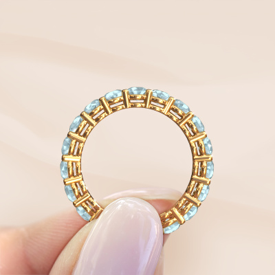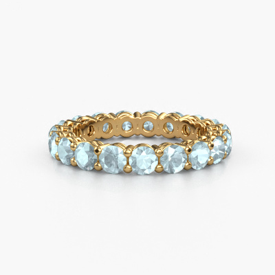 This is our Michelle full 3.4 ring. This specific type is called an eternity ring and it is set with a continuous line of identically cut gemstones. The ring is made in 14 Carat gold and is set with small aquamarine, 3.4 mm. This gold Eternity ring is a perfectly beautiful and meaningful way to give your proposal that special touch. The magnificent evenly shaped aquamarine are pave set around the ring. The identical aquamarine are carefully selected to give the ring a maximum effect. Do keep in mind we use natural resources so small differences between stones are common. The special effect is enhanced due to precise positioning of the aquamarine. This requires the utmost precision and a skillful hand but for our skilled artisans this is what excites them. The result is a stackable ring with a row of aquamarine which seem to have no beginning nor end. The perfect symbol of your love for her! Isn't she a beauty?By using a combination of the latest modern techniques, combined with ancient crafting, we can make all our rings in our own studio. Each jewel is made to order. This is advantageous because we can offer you a price you won't find anywhere else.New jewelry designs are added to our online collection daily. Our team of passionate designers strive to create extraordinary and diverse designs. Have you seen a ring you like? Please feel free to contact us. Based on a good price/ quality ratio, we will make you an offer you can't refuse!To make it easier for you, we offer a 30 day return policy. Check our terms and conditions.