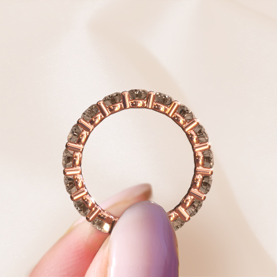 This is our Heddy rnd 3.7 ring. This specific type is called an eternity ring and it is set with a continuous line of identically cut gemstones. The ring is made in 14 Carat rose gold and is set with small brown diamonds, 0.20 crt. This rose gold Eternity ring is a perfectly beautiful and meaningful way to give your proposal that special touch. The magnificent evenly shaped brown diamonds are pave set around the ring. The identical brown diamonds are carefully selected to give the ring a maximum effect. Do keep in mind we use natural resources so small differences between stones are common. The special effect is enhanced due to precise positioning of the brown diamonds. This requires the utmost precision and a skillful hand but for our skilled artisans this is what excites them. The result is a stackable ring with a row of brown diamonds which seem to have no beginning nor end. The perfect symbol of your love for her! Isn't she a beauty?By using our modern techniques, we can design and customize the finest quality jewels with the utmost care for you. Our rings are always priced 30 percent lower than other jewelers. We make rings to order, so we don't have to maintain a large stock. If you have a certain budget, we are more than happy to advice you accordingly.New jewelry designs are added to our online collection daily. Our team of passionate designers strive to create extraordinary and diverse designs. Have you seen a ring you like? Please feel free to contact us. Based on a good price/ quality ratio, we will make you an offer you can't refuse!To make it easier for you, we offer a 30 day return policy. Check our terms and conditions.