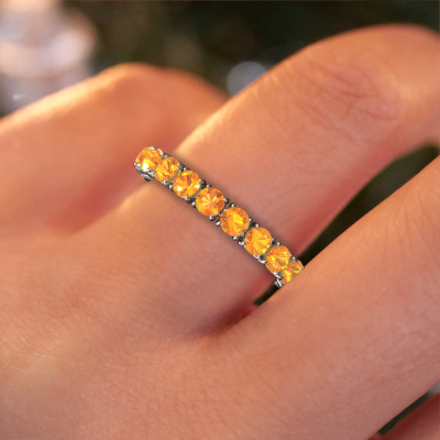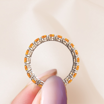 This is our Vivienne 2.9 ring. This specific type is called an eternity ring and it is set with a continuous line of identically cut gemstones. The ring is made in 14 Carat white gold and is set with small citrin, 2.9 mm. This white gold Eternity ring is a perfectly beautiful and meaningful way to give your proposal that special touch. The magnificent evenly shaped citrin are pave set around the ring. The identical citrin are carefully selected to give the ring a maximum effect. Do keep in mind we use natural resources so small differences between stones are common. The special effect is enhanced due to precise positioning of the citrin. This requires the utmost precision and a skillful hand but for our skilled artisans this is what excites them. The result is a ring with a row of citrin which seem to have no beginning nor end. The perfect symbol of your love for her! Isn't she a beauty?By using our modern techniques, we can design and customize the finest quality jewels with the utmost care for you. Our rings are always priced 30 percent lower than other jewelers. We make rings to order, so we don't have to maintain a large stock. If you have a certain budget, we are more than happy to advice you accordingly.New jewelry designs are added to our online collection daily. Our team of passionate designers strive to create extraordinary and diverse designs. Have you seen a ring you like? Please feel free to contact us. Based on a good price/ quality ratio, we will make you an offer you can't refuse!To make it easier for you, we offer a 30 day return policy. Check our terms and conditions.