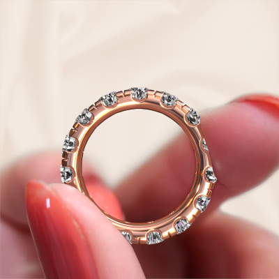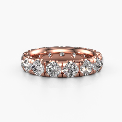 This is our Jackie 4.2 ring. This specific type is called an eternity ring and it is set with a continuous line of identically cut gemstones. The ring is made in 14 Carat rose gold and is set with small diamonds, 0.30 crt. This rose gold Eternity ring is a perfectly beautiful and meaningful way to give your proposal that special touch. The magnificent evenly shaped diamonds are pave set around the ring. The identical diamonds are carefully selected to give the ring a maximum effect. Do keep in mind we use natural resources so small differences between stones are common. The special effect is enhanced due to precise positioning of the diamonds. This requires the utmost precision and a skillful hand but for our skilled artisans this is what excites them. The result is a stackable ring with a row of diamonds which seem to have no beginning nor end. The perfect symbol of your love for her! Isn't she a beauty?After receiving your order, our goldsmiths will start the creative process of making your Jackie 4.2 ring. We don't keep stock. This is advantageous because these costs will not be passed on to you. Therefore, we can offer jewelry at exceptionally low prices.New jewelry designs are added to our online collection daily. Our team of passionate designers strive to create extraordinary and diverse designs. Have you seen a ring you like? Please feel free to contact us. Based on a good price/ quality ratio, we will make you an offer you can't refuse!To make it easier for you, we offer a 30 day return policy. Check our terms and conditions.