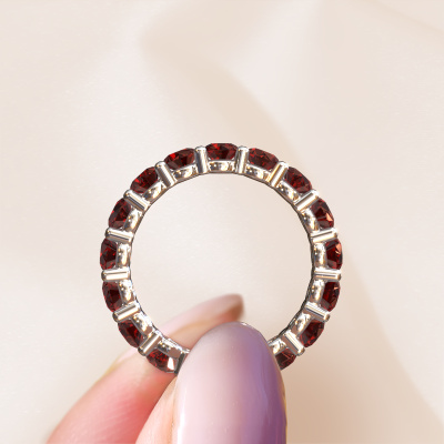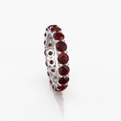 This is our Heddy rnd 3.7 ring. This specific type is called an eternity ring and it is set with a continuous line of identically cut gemstones. The ring is made in 14 Carat white gold and is set with small garnet, 3.7 mm. This white gold Eternity ring is a perfectly beautiful and meaningful way to give your proposal that special touch. The magnificent evenly shaped garnet are pave set around the ring. The identical garnet are carefully selected to give the ring a maximum effect. Do keep in mind we use natural resources so small differences between stones are common. The special effect is enhanced due to precise positioning of the garnet. This requires the utmost precision and a skillful hand but for our skilled artisans this is what excites them. The result is a stackable ring with a row of garnet which seem to have no beginning nor end. The perfect symbol of your love for her! Isn't she a beauty?By using our modern techniques, we can design and customize the finest quality jewels with the utmost care for you. Our rings are always priced 30 percent lower than other jewelers. We make rings to order, so we don't have to maintain a large stock. If you have a certain budget, we are more than happy to advice you accordingly.New jewelry designs are added to our online collection daily. Our team of passionate designers strive to create extraordinary and diverse designs. Have you seen a ring you like? Please feel free to contact us. Based on a good price/ quality ratio, we will make you an offer you can't refuse!To make it easier for you, we offer a 30 day return policy. Check our terms and conditions.
