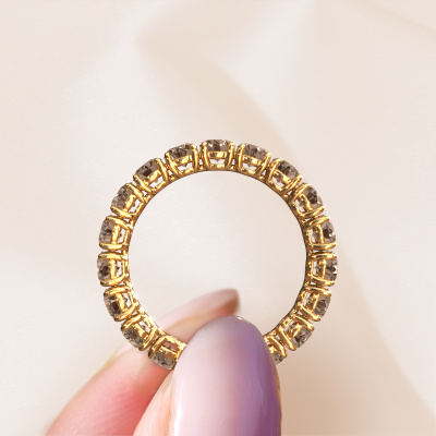 This is our Vivienne 3.4 ring. This specific type is called an eternity ring and it is set with a continuous line of identically cut gemstones. The ring is made in 14 Carat gold and is set with small brown diamonds, 2.700 crt. The amazing brown diamonds are identical in size and are set in the ring band. Our brown diamonds are selected with great care so they are identical, which gives the best result. In order to get the best result, our artisans position all brown diamonds by hand with the utmost care. Our Goldsmiths have one ambition, which is creating the perfect ring. That is why we love what we do. In the end you get a stunning classic gold stackable ring with a row of brown diamonds which seem to have no beginning nor end. The perfect symbol of your undying love for her! How special is that!Are you on a budget? Please feel free to contact us, so we can go discuss your options. We offer our rings at guaranteed best price, because we make them to order. You won't find such a price anywhere else!Our team of talented, passionate designers add new ring designs to our online collection daily. Our objective in doing so, is to be able to offer you a wide variety of jewels. Please feel free to request a quote if you have specific wishes for your ring. We guarantee to make you an offer you can't refuse.To make it easier for you, we offer a 30 day return policy. Check our terms and conditions.