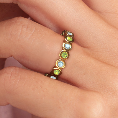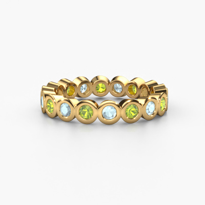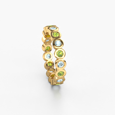 This is our Edwina 2 ring. This specific type is called an eternity ring and it is set with a continuous line of identically cut gemstones. The ring is made in 14 Carat gold and is set with small peridot, 2.5 mm. The amazing peridot are identical in size and are set in the ring band. Our peridot are selected with great care so they are identical, which gives the best result. In order to get the best result, our artisans position all peridot by hand with the utmost care. Our Goldsmiths have one ambition, which is creating the perfect ring. That is why we love what we do. In the end you get a stunning trendy gold stackable ring with a row of peridot which seem to have no beginning nor end. The perfect symbol of your undying love for her! How special is that!By using our modern techniques, we can design and customize the finest quality jewels with the utmost care for you. Our rings are always priced 30 percent lower than other jewelers. We make rings to order, so we don't have to maintain a large stock. If you have a certain budget, we are more than happy to advice you accordingly.Our talented designers add new designs to our online collection daily. Together they create a diverse collection of the finest jewelry. If you prefer to make a ring according your own design, please feel free to request a quote. We will make you an amazing offer, based on quality and price.To make it easier for you, we offer a 30 day return policy. Check our terms and conditions.