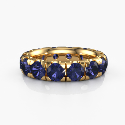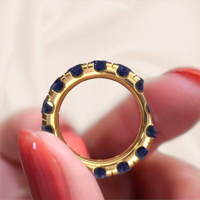 This is our Jackie 4.7 ring. This specific type is called an eternity ring and it is set with a continuous line of identically cut gemstones. The ring is made in 14 Carat gold and is set with small sapphire, 4.7 mm. The amazing sapphire are identical in size and are set in the ring band. Our sapphire are selected with great care so they are identical, which gives the best result. In order to get the best result, our artisans position all sapphire by hand with the utmost care. Our Goldsmiths have one ambition, which is creating the perfect ring. That is why we love what we do. In the end you get a stunning exclusive gold stackable ring with a row of sapphire which seem to have no beginning nor end. The perfect symbol of your undying love for her! How special is that!Because we design and deliver our own rings, we can offer you a ring at a price you won't find anywhere else. A ring is made to order, which helps prevent excess supplies, so we can make you a great price offer. We understand it feels risky, buying your ring online, but we will gladly assist in the designing process, taking your budget into consideration.Our team of talented, passionate designers add new ring designs to our online collection daily. Our objective in doing so, is to be able to offer you a wide variety of jewels. Please feel free to request a quote if you have specific wishes for your ring. We guarantee to make you an offer you can't refuse.To make it easier for you, we offer a 30 day return policy. Check our terms and conditions.