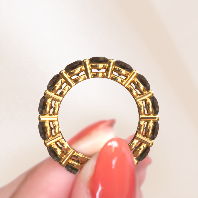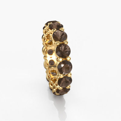 This is our Michelle full 4.7 ring. This specific type is called an eternity ring and it is set with a continuous line of identically cut gemstones. The ring is made in 14 Carat gold and is set with small smokey quartz, 4.7 mm. The amazing smokey quartz are identical in size and are set in the ring band. Our smokey quartz are selected with great care so they are identical, which gives the best result. In order to get the best result, our artisans position all smokey quartz by hand with the utmost care. Our Goldsmiths have one ambition, which is creating the perfect ring. That is why we love what we do. In the end you get a stunning exclusive gold stackable ring with a row of smokey quartz which seem to have no beginning nor end. The perfect symbol of your undying love for her! How special is that!Because we design and deliver our own rings, we can offer you a ring at a price you won't find anywhere else. A ring is made to order, which helps prevent excess supplies, so we can make you a great price offer. We understand it feels risky, buying your ring online, but we will gladly assist in the designing process, taking your budget into consideration.Our team of talented, passionate designers add new ring designs to our online collection daily. Our objective in doing so, is to be able to offer you a wide variety of jewels. Please feel free to request a quote if you have specific wishes for your ring. We guarantee to make you an offer you can't refuse.To make it easier for you, we offer a 30 day return policy. Check our terms and conditions.