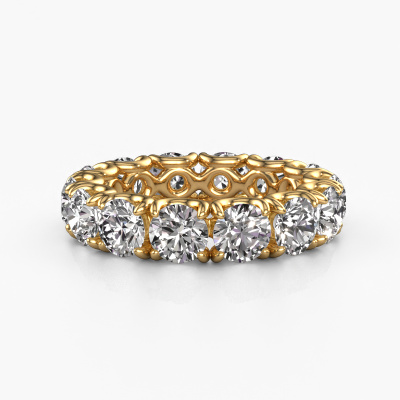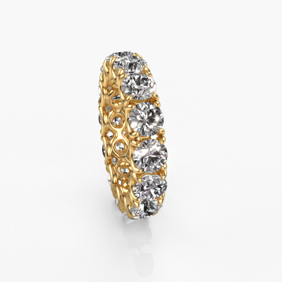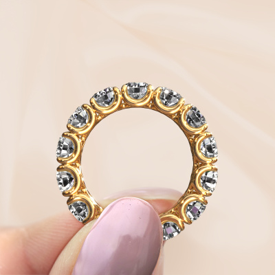 This is our Estee 4.7 ring. This specific type is called an eternity ring and it is set with a continuous line of identically cut gemstones. The ring is made in 14 Carat gold and is set with small lab grown diamonds, 0.40 crt. This gold Eternity ring is a perfectly beautiful and meaningful way to give your proposal that special touch. The magnificent evenly shaped lab grown diamonds are pave set around the ring. The identical lab grown diamonds are carefully selected to give the ring a maximum effect. Do keep in mind we use natural resources so small differences between stones are common. The special effect is enhanced due to precise positioning of the lab grown diamonds. This requires the utmost precision and a skillful hand but for our skilled artisans this is what excites them. The result is a ring with a row of lab grown diamonds which seem to have no beginning nor end. The perfect symbol of your love for her! Isn't she a beauty?By using our modern techniques, we can design and customize the finest quality jewels with the utmost care for you. Our rings are always priced 30 percent lower than other jewelers. We make rings to order, so we don't have to maintain a large stock. If you have a certain budget, we are more than happy to advice you accordingly.