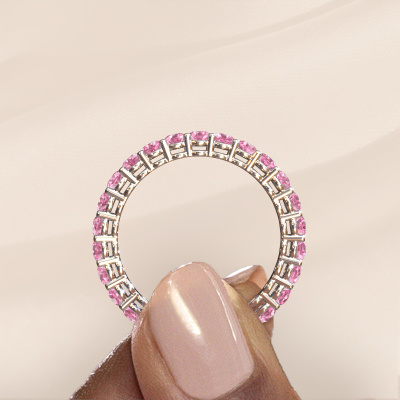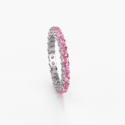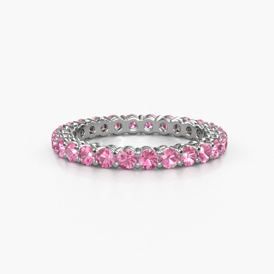 This is our Michelle full 2.4 ring. This specific type is called an eternity ring and it is set with a continuous line of identically cut gemstones. The ring is made in 14 Carat white gold and is set with small pink sapphire, 2.4 mm. This white gold Eternity ring is a perfectly beautiful and meaningful way to give your proposal that special touch. The magnificent evenly shaped pink sapphire are pave set around the ring. The identical pink sapphire are carefully selected to give the ring a maximum effect. Do keep in mind we use natural resources so small differences between stones are common. The special effect is enhanced due to precise positioning of the pink sapphire. This requires the utmost precision and a skillful hand but for our skilled artisans this is what excites them. The result is a stackable ring with a row of pink sapphire which seem to have no beginning nor end. The perfect symbol of your love for her! Isn't she a beauty?After receiving your order, our goldsmiths will start the creative process of making your Michelle full 2.4 ring. We don't keep stock. This is advantageous because these costs will not be passed on to you. Therefore, we can offer jewelry at exceptionally low prices.
