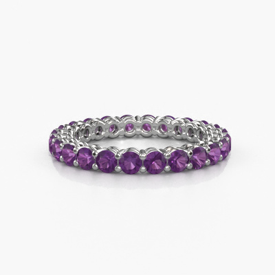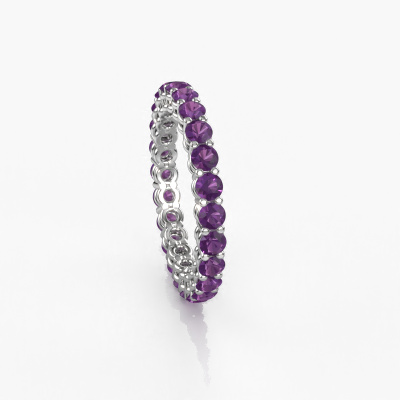 This is our Michelle full 2.7 ring. This specific type is called an eternity ring and it is set with a continuous line of identically cut gemstones. The ring is made in platinum and is set with small amethysten, 2.7 mm. The amazing amethysten are identical in size and are set in the ring band. Our amethysten are selected with great care so they are identical, which gives the best result. In order to get the best result, our artisans position all amethysten by hand with the utmost care. Our Goldsmiths have one ambition, which is creating the perfect ring. That is why we love what we do. In the end you get a stunning classic platinum stackable ring with a row of amethysten which seem to have no beginning nor end. The perfect symbol of your undying love for her! How special is that!By using a combination of the latest modern techniques, combined with ancient crafting, we can make all our rings in our own studio. Each jewel is made to order. This is advantageous because we can offer you a price you won't find anywhere else.New jewelry designs are added to our online collection daily. Our team of passionate designers strive to create extraordinary and diverse designs. Have you seen a ring you like? Please feel free to contact us. Based on a good price/ quality ratio, we will make you an offer you can't refuse!To make it easier for you, we offer a 30 day return policy. Check our terms and conditions.