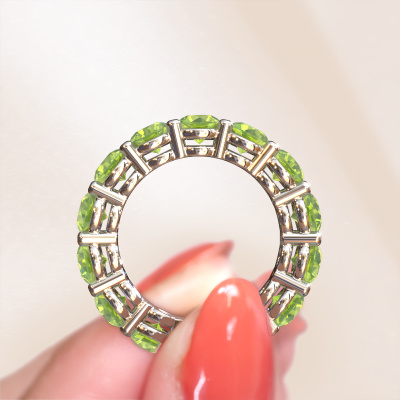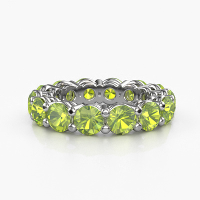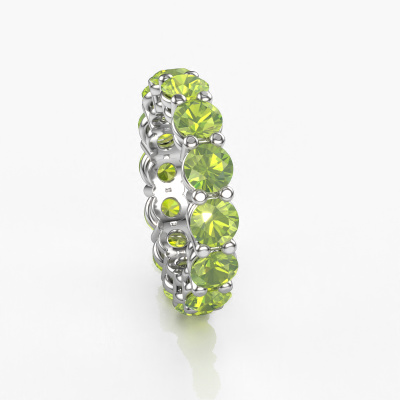This is our Michelle full 4.7 ring. This specific type is called an eternity ring and it is set with a continuous line of identically cut gemstones. The ring is made in platinum and is set with small peridot, 4.7 mm. The amazing peridot are identical in size and are set in the ring band. Our peridot are selected with great care so they are identical, which gives the best result. In order to get the best result, our artisans position all peridot by hand with the utmost care. Our Goldsmiths have one ambition, which is creating the perfect ring. That is why we love what we do. In the end you get a stunning exclusive platinum stackable ring with a row of peridot which seem to have no beginning nor end. The perfect symbol of your undying love for her! How special is that!Because we design and deliver our own rings, we can offer you a ring at a price you won't find anywhere else. A ring is made to order, which helps prevent excess supplies, so we can make you a great price offer. We understand it feels risky, buying your ring online, but we will gladly assist in the designing process, taking your budget into consideration.Our team of talented, passionate designers add new ring designs to our online collection daily. Our objective in doing so, is to be able to offer you a wide variety of jewels. Please feel free to request a quote if you have specific wishes for your ring. We guarantee to make you an offer you can't refuse.To make it easier for you, we offer a 30 day return policy. Check our terms and conditions.