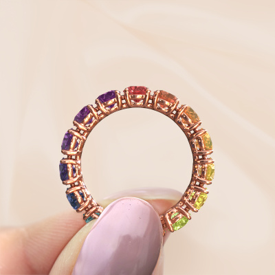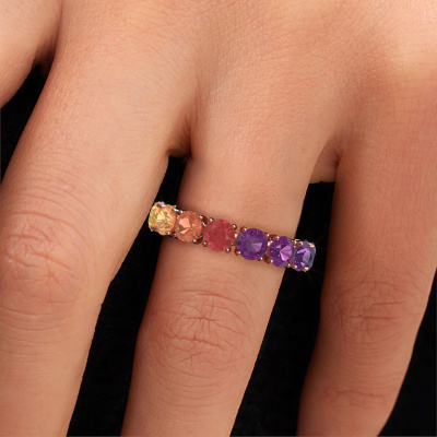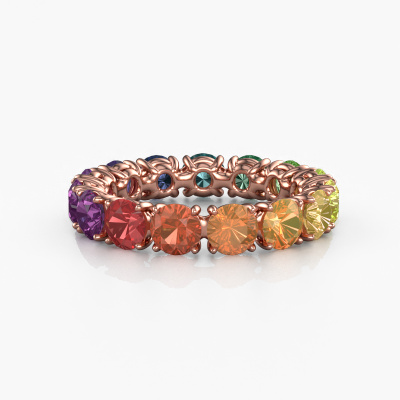 This is our Vivienne 4.2 ring. This specific type is called an eternity ring and it is set with a continuous line of identically cut gemstones. The ring is made in 14 Carat rose gold and is set with small Rainbow sapphire 1, 4.2 mm. This rose gold Eternity ring is a perfectly beautiful and meaningful way to give your proposal that special touch. The magnificent evenly shaped Rainbow sapphire 1 are pave set around the ring. The identical Rainbow sapphire 1 are carefully selected to give the ring a maximum effect. Do keep in mind we use natural resources so small differences between stones are common. The special effect is enhanced due to precise positioning of the Rainbow sapphire 1. This requires the utmost precision and a skillful hand but for our skilled artisans this is what excites them. The result is a ring with a row of Rainbow sapphire 1 which seem to have no beginning nor end. The perfect symbol of your love for her! Isn't she a beauty?By using a combination of the latest modern techniques, combined with ancient crafting, we can make all our rings in our own studio. Each jewel is made to order. This is advantageous because we can offer you a price you won't find anywhere else.