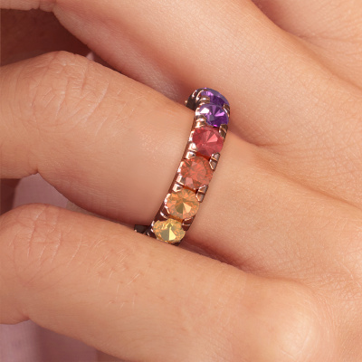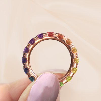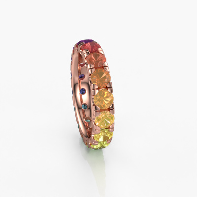 This Jackie 4.0 stackable ring in 14 Carat rose gold is set with Rainbow sapphire 1. This rose gold stacked Jackie 4.0 ring is the perfect addition to your ring collection! As the name suggests, it is a ring which can be combined on one finger with another ring. It gives you the opportunity to create your own style. A stacked ring usually represents a certain memory of someone special or a memorable moment. It is common to combine a stacked ring, representing an anniversary, with a wedding ring. But this eternity ring, combined with your other rings, also makes a classy fashion item. As soon as you finished designing your Jackie 4.0 stackable ring with our online tool, our goldsmiths will start their creative process of making your ring. This will be done with passion and care, according ancient crafting. On top of that, our jewels are made of eco-friendly materials. Simply customize online with our online tool, if you want any changes made. If you want specific changes made to your Jackie 4.0 stackable ring, that are unavailable in our online tool, please feel free to contact our expert designers.Are you on a budget? Please feel free to contact us, so we can go discuss your options. We offer our rings at guaranteed best price, because we make them to order. You won't find such a price anywhere else!To make it easier for you, we offer a 30 day return policy. Check our terms and conditions.