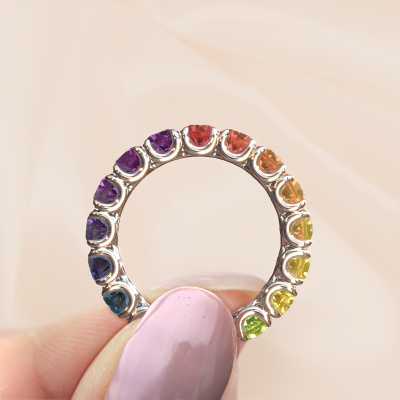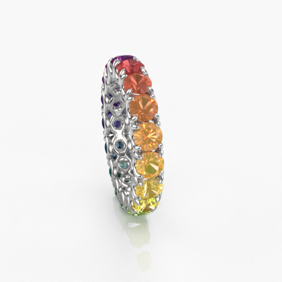 This Estee 4.0 ring in 14 Carat white gold is set with Rainbow sapphire 1. This white gold stacked Estee 4.0 ring is the perfect addition to your ring collection! As the name suggests, it is a ring which can be combined on one finger with another ring. It gives you the opportunity to create your own style. A stacked ring usually represents a certain memory of someone special or a memorable moment. It is common to combine a stacked ring, representing an anniversary, with a wedding ring. But this eternity ring, combined with your other rings, also makes a classy fashion item. As soon as you finished designing your Estee 4.0 ring with our online tool, our goldsmiths will start their creative process of making your ring. This will be done with passion and care, according ancient crafting. On top of that, our jewels are made of eco-friendly materials. Simply customize online with our online tool, if you want any changes made. If you want specific changes made to your Estee 4.0 ring, that are unavailable in our online tool, please feel free to contact our expert designers.By using our modern techniques, we can design and customize the finest quality jewels with the utmost care for you. Our rings are always priced 30 percent lower than other jewelers. We make rings to order, so we don't have to maintain a large stock. If you have a certain budget, we are more than happy to advice you accordingly.To make it easier for you, we offer a 30 day return policy. Check our terms and conditions.