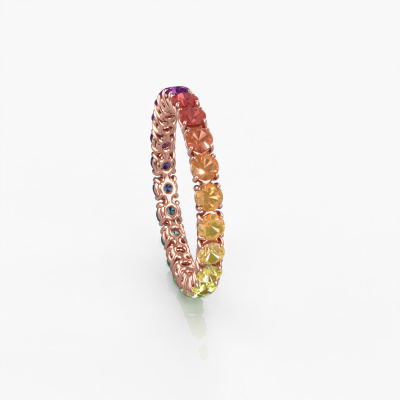This is our Vivienne 2.7 ring. This specific type is called an eternity ring and it is set with a continuous line of identically cut gemstones. The ring is made in 14 Carat rose gold and is set with small Rainbow sapphire 1, 2.7 mm. The amazing Rainbow sapphire 1 are identical in size and are set in the ring band. Our Rainbow sapphire 1 are selected with great care so they are identical, which gives the best result. In order to get the best result, our artisans position all Rainbow sapphire 1 by hand with the utmost care. Our Goldsmiths have one ambition, which is creating the perfect ring. That is why we love what we do. In the end you get a stunning classic rose gold ring with a row of Rainbow sapphire 1 which seem to have no beginning nor end. The perfect symbol of your undying love for her! How special is that!After receiving your order, our goldsmiths will passionately start the creative process of making your ring in our own studio. Because we don't have a big stockpile, these costs will not be passed on to you. Our pricing is proof of that! We offer top quality jewels at lowest price, guaranteed.Our talented designers add new designs to our online collection daily. Together they create a diverse collection of the finest jewelry. If you prefer to make a ring according your own design, please feel free to request a quote. We will make you an amazing offer, based on quality and price.To make it easier for you, we offer a 30 day return policy. Check our terms and conditions.