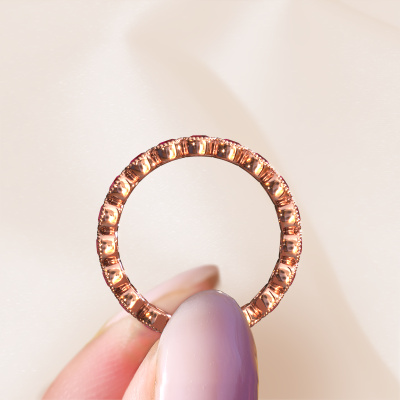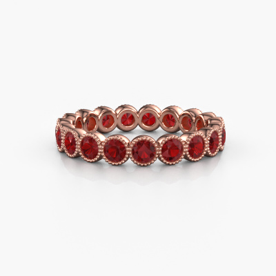 This is our Mariam 0.07 ring. This specific type is called an eternity ring and it is set with a continuous line of identically cut gemstones. The ring is made in 14 Carat rose gold and is set with small ruby, 2.7 mm. The amazing ruby are identical in size and are set in the ring band. Our ruby are selected with great care so they are identical, which gives the best result. In order to get the best result, our artisans position all ruby by hand with the utmost care. Our Goldsmiths have one ambition, which is creating the perfect ring. That is why we love what we do. In the end you get a stunning trendy rose gold ring with a row of ruby which seem to have no beginning nor end. The perfect symbol of your undying love for her! How special is that!After receiving your order, our goldsmiths will passionately start the creative process of making your ring in our own studio. Because we don't have a big stockpile, these costs will not be passed on to you. Our pricing is proof of that! We offer top quality jewels at lowest price, guaranteed.Our talented designers add new designs to our online collection daily. Together they create a diverse collection of the finest jewelry. If you prefer to make a ring according your own design, please feel free to request a quote. We will make you an amazing offer, based on quality and price.To make it easier for you, we offer a 30 day return policy. Check our terms and conditions.