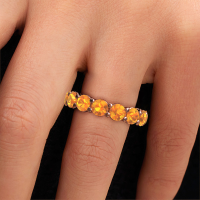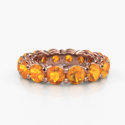 This is our Michelle full 4.7 ring. This specific type is called an eternity ring and it is set with a continuous line of identically cut gemstones. The ring is made in 14 Carat rose gold and is set with small citrin, 4.7 mm. The amazing citrin are identical in size and are set in the ring band. Our citrin are selected with great care so they are identical, which gives the best result. In order to get the best result, our artisans position all citrin by hand with the utmost care. Our Goldsmiths have one ambition, which is creating the perfect ring. That is why we love what we do. In the end you get a stunning exclusive rose gold stackable ring with a row of citrin which seem to have no beginning nor end. The perfect symbol of your undying love for her! How special is that!Because we design and deliver our own rings, we can offer you a ring at a price you won't find anywhere else. A ring is made to order, which helps prevent excess supplies, so we can make you a great price offer. We understand it feels risky, buying your ring online, but we will gladly assist in the designing process, taking your budget into consideration.Our team of talented, passionate designers add new ring designs to our online collection daily. Our objective in doing so, is to be able to offer you a wide variety of jewels. Please feel free to request a quote if you have specific wishes for your ring. We guarantee to make you an offer you can't refuse.To make it easier for you, we offer a 30 day return policy. Check our terms and conditions.