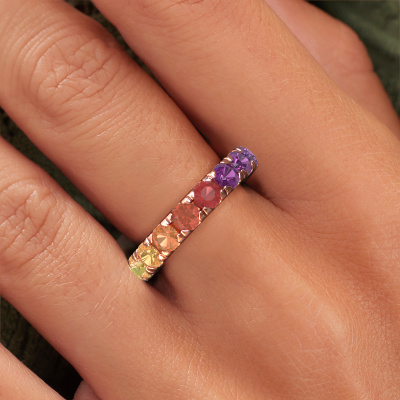 This is our Jackie 3.7 ring. This specific type is called an eternity ring and it is set with a continuous line of identically cut gemstones. The ring is made in 14 Carat rose gold and is set with small Rainbow sapphire 1, 3.7 mm. The amazing Rainbow sapphire 1 are identical in size and are set in the ring band. Our Rainbow sapphire 1 are selected with great care so they are identical, which gives the best result. In order to get the best result, our artisans position all Rainbow sapphire 1 by hand with the utmost care. Our Goldsmiths have one ambition, which is creating the perfect ring. That is why we love what we do. In the end you get a stunning modern rose gold stackable ring with a row of Rainbow sapphire 1 which seem to have no beginning nor end. The perfect symbol of your undying love for her! How special is that!By using our modern techniques, we can design and customize the finest quality jewels with the utmost care for you. Our rings are always priced 30 percent lower than other jewelers. We make rings to order, so we don't have to maintain a large stock. If you have a certain budget, we are more than happy to advice you accordingly.New jewelry designs are added to our online collection daily. Our team of passionate designers strive to create extraordinary and diverse designs. Have you seen a ring you like? Please feel free to contact us. Based on a good price/ quality ratio, we will make you an offer you can't refuse!To make it easier for you, we offer a 30 day return policy. Check our terms and conditions.