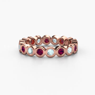 This is our Edwina 2 ring. This specific type is called an eternity ring and it is set with a continuous line of identically cut gemstones. The ring is made in 14 Carat rose gold and is set with small rhodolite, 2.5 mm. The amazing rhodolite are identical in size and are set in the ring band. Our rhodolite are selected with great care so they are identical, which gives the best result. In order to get the best result, our artisans position all rhodolite by hand with the utmost care. Our Goldsmiths have one ambition, which is creating the perfect ring. That is why we love what we do. In the end you get a stunning trendy rose gold stackable ring with a row of rhodolite which seem to have no beginning nor end. The perfect symbol of your undying love for her! How special is that!By using our modern techniques, we can design and customize the finest quality jewels with the utmost care for you. Our rings are always priced 30 percent lower than other jewelers. We make rings to order, so we don't have to maintain a large stock. If you have a certain budget, we are more than happy to advice you accordingly.Our talented designers add new designs to our online collection daily. Together they create a diverse collection of the finest jewelry. If you prefer to make a ring according your own design, please feel free to request a quote. We will make you an amazing offer, based on quality and price.To make it easier for you, we offer a 30 day return policy. Check our terms and conditions.