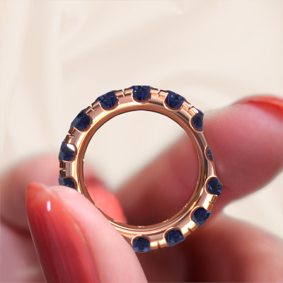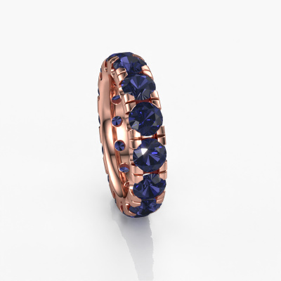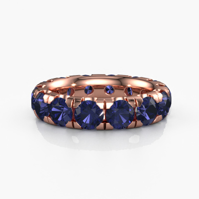 This is our Jackie 4.7 ring. This specific type is called an eternity ring and it is set with a continuous line of identically cut gemstones. The ring is made in 14 Carat rose gold and is set with small sapphire, 4.7 mm. The amazing sapphire are identical in size and are set in the ring band. Our sapphire are selected with great care so they are identical, which gives the best result. In order to get the best result, our artisans position all sapphire by hand with the utmost care. Our Goldsmiths have one ambition, which is creating the perfect ring. That is why we love what we do. In the end you get a stunning exclusive rose gold stackable ring with a row of sapphire which seem to have no beginning nor end. The perfect symbol of your undying love for her! How special is that!Because we design and deliver our own rings, we can offer you a ring at a price you won't find anywhere else. A ring is made to order, which helps prevent excess supplies, so we can make you a great price offer. We understand it feels risky, buying your ring online, but we will gladly assist in the designing process, taking your budget into consideration.Our team of talented, passionate designers add new ring designs to our online collection daily. Our objective in doing so, is to be able to offer you a wide variety of jewels. Please feel free to request a quote if you have specific wishes for your ring. We guarantee to make you an offer you can't refuse.To make it easier for you, we offer a 30 day return policy. Check our terms and conditions.