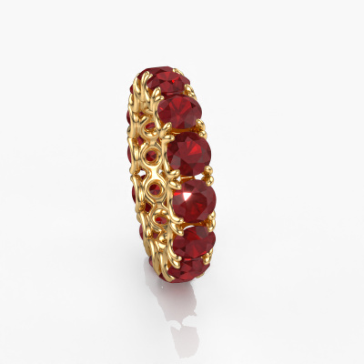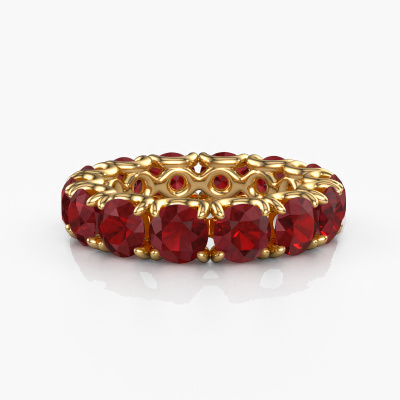 This is our Estee 4.7 ring. This specific type is called an eternity ring and it is set with a continuous line of identically cut gemstones. The ring is made in 14 Carat gold and is set with small ruby, 4.7 mm. This gold Eternity ring is a perfectly beautiful and meaningful way to give your proposal that special touch. The magnificent evenly shaped ruby are pave set around the ring. The identical ruby are carefully selected to give the ring a maximum effect. Do keep in mind we use natural resources so small differences between stones are common. The special effect is enhanced due to precise positioning of the ruby. This requires the utmost precision and a skillful hand but for our skilled artisans this is what excites them. The result is a ring with a row of ruby which seem to have no beginning nor end. The perfect symbol of your love for her! Isn't she a beauty?By using our modern techniques, we can design and customize the finest quality jewels with the utmost care for you. Our rings are always priced 30 percent lower than other jewelers. We make rings to order, so we don't have to maintain a large stock. If you have a certain budget, we are more than happy to advice you accordingly.