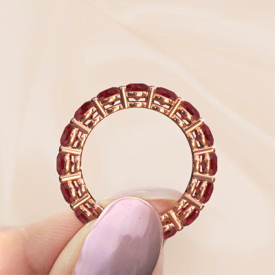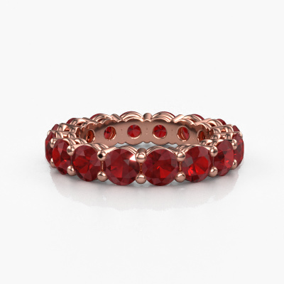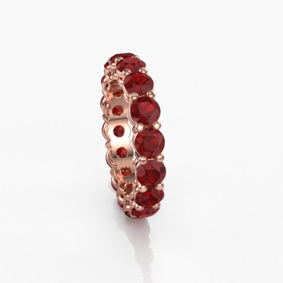 This is our Michelle full 4.2 ring. This specific type is called an eternity ring and it is set with a continuous line of identically cut gemstones. The ring is made in 14 Carat rose gold and is set with small ruby, 4.2 mm. This rose gold Eternity ring is a perfectly beautiful and meaningful way to give your proposal that special touch. The magnificent evenly shaped ruby are pave set around the ring. The identical ruby are carefully selected to give the ring a maximum effect. Do keep in mind we use natural resources so small differences between stones are common. The special effect is enhanced due to precise positioning of the ruby. This requires the utmost precision and a skillful hand but for our skilled artisans this is what excites them. The result is a stackable ring with a row of ruby which seem to have no beginning nor end. The perfect symbol of your love for her! Isn't she a beauty?After receiving your order, our goldsmiths will start the creative process of making your Michelle full 4.2 ring. We don't keep stock. This is advantageous because these costs will not be passed on to you. Therefore, we can offer jewelry at exceptionally low prices.New jewelry designs are added to our online collection daily. Our team of passionate designers strive to create extraordinary and diverse designs. Have you seen a ring you like? Please feel free to contact us. Based on a good price/ quality ratio, we will make you an offer you can't refuse!To make it easier for you, we offer a 30 day return policy. Check our terms and conditions.