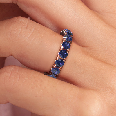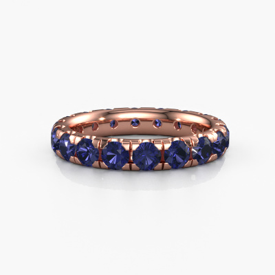 This is our Jackie 3.4 ring. This specific type is called an eternity ring and it is set with a continuous line of identically cut gemstones. The ring is made in 14 Carat rose gold and is set with small sapphire, 3.4 mm. This rose gold Eternity ring is a perfectly beautiful and meaningful way to give your proposal that special touch. The magnificent evenly shaped sapphire are pave set around the ring. The identical sapphire are carefully selected to give the ring a maximum effect. Do keep in mind we use natural resources so small differences between stones are common. The special effect is enhanced due to precise positioning of the sapphire. This requires the utmost precision and a skillful hand but for our skilled artisans this is what excites them. The result is a stackable ring with a row of sapphire which seem to have no beginning nor end. The perfect symbol of your love for her! Isn't she a beauty?After receiving your order, our goldsmiths will passionately start the creative process of making your ring in our own studio. Because we don't have a big stockpile, these costs will not be passed on to you. Our pricing is proof of that! We offer top quality jewels at lowest price, guaranteed.Our talented designers add new designs to our online collection daily. Together they create a diverse collection of the finest jewelry. If you prefer to make a ring according your own design, please feel free to request a quote. We will make you an amazing offer, based on quality and price.To make it easier for you, we offer a 30 day return policy. Check our terms and conditions.