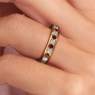 This is our Nienke ring. This specific type is called an eternity ring and it is set with a continuous line of identically cut gemstones. The ring is made in 14 Carat gold and is set with small garnet, 2.2 mm. The amazing garnet are identical in size and are set in the ring band. Our garnet are selected with great care so they are identical, which gives the best result. In order to get the best result, our artisans position all garnet by hand with the utmost care. Our Goldsmiths have one ambition, which is creating the perfect ring. That is why we love what we do. In the end you get a stunning modern gold stackable ring with a row of garnet which seem to have no beginning nor end. The perfect symbol of your undying love for her! How special is that!After receiving your order, our goldsmiths will start the creative process of making your Nienke ring. We don't keep stock. This is advantageous because these costs will not be passed on to you. Therefore, we can offer jewelry at exceptionally low prices.Our team of talented, passionate designers add new ring designs to our online collection daily. Our objective in doing so, is to be able to offer you a wide variety of jewels. Please feel free to request a quote if you have specific wishes for your ring. We guarantee to make you an offer you can't refuse.To make it easier for you, we offer a 30 day return policy. Check our terms and conditions.