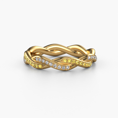 This is our Swing full ring. This specific type is called an eternity ring and it is set with a continuous line of identically cut gemstones. The ring is made in 14 Carat gold and is set with small yellow sapphire, 1 mm. The amazing yellow sapphire are identical in size and are set in the ring band. Our yellow sapphire are selected with great care so they are identical, which gives the best result. In order to get the best result, our artisans position all yellow sapphire by hand with the utmost care. Our Goldsmiths have one ambition, which is creating the perfect ring. That is why we love what we do. In the end you get a stunning fantasy gold stackable ring with a row of yellow sapphire which seem to have no beginning nor end. The perfect symbol of your undying love for her! How special is that!After receiving your order, our goldsmiths will passionately start the creative process of making your ring in our own studio. Because we don't have a big stockpile, these costs will not be passed on to you. Our pricing is proof of that! We offer top quality jewels at lowest price, guaranteed.New jewelry designs are added to our online collection daily. Our team of passionate designers strive to create extraordinary and diverse designs. Have you seen a ring you like? Please feel free to contact us. Based on a good price/ quality ratio, we will make you an offer you can't refuse!To make it easier for you, we offer a 30 day return policy. Check our terms and conditions.