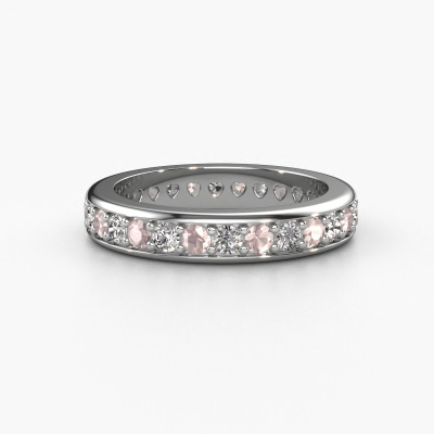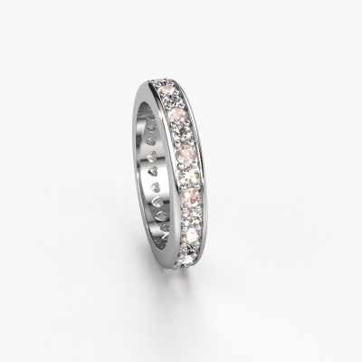 This is our Nienke ring. This specific type is called an eternity ring and it is set with a continuous line of identically cut gemstones. The ring is made in platinum and is set with small morganite champagne, 2.2 mm. The amazing morganite champagne are identical in size and are set in the ring band. Our morganite champagne are selected with great care so they are identical, which gives the best result. In order to get the best result, our artisans position all morganite champagne by hand with the utmost care. Our Goldsmiths have one ambition, which is creating the perfect ring. That is why we love what we do. In the end you get a stunning exclusive platinum stackable ring with a row of morganite champagne which seem to have no beginning nor end. The perfect symbol of your undying love for her! How special is that!