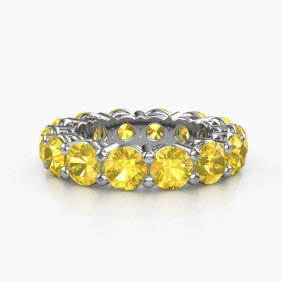 This is our Michelle full 5.0 ring. This specific type is called an eternity ring and it is set with a continuous line of identically cut gemstones. The ring is made in platinum and is set with small yellow sapphire, 5 mm. The amazing yellow sapphire are identical in size and are set in the ring band. Our yellow sapphire are selected with great care so they are identical, which gives the best result. In order to get the best result, our artisans position all yellow sapphire by hand with the utmost care. Our Goldsmiths have one ambition, which is creating the perfect ring. That is why we love what we do. In the end you get a stunning exclusive platinum stackable ring with a row of yellow sapphire which seem to have no beginning nor end. The perfect symbol of your undying love for her! How special is that!By using a combination of the latest modern techniques, combined with ancient crafting, we can make all our rings in our own studio. Each jewel is made to order. This is advantageous because we can offer you a price you won't find anywhere else.New jewelry designs are added to our online collection daily. Our team of passionate designers strive to create extraordinary and diverse designs. Have you seen a ring you like? Please feel free to contact us. Based on a good price/ quality ratio, we will make you an offer you can't refuse!To make it easier for you, we offer a 30 day return policy. Check our terms and conditions.