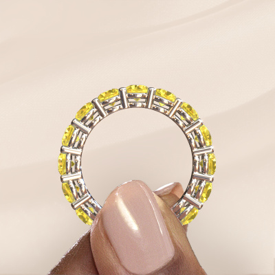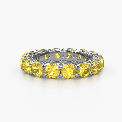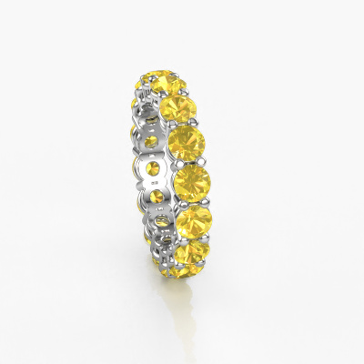 This is our Michelle full 4.0 ring. This specific type is called an eternity ring and it is set with a continuous line of identically cut gemstones. The ring is made in platinum and is set with small yellow sapphire, 4 mm. The amazing yellow sapphire are identical in size and are set in the ring band. Our yellow sapphire are selected with great care so they are identical, which gives the best result. In order to get the best result, our artisans position all yellow sapphire by hand with the utmost care. Our Goldsmiths have one ambition, which is creating the perfect ring. That is why we love what we do. In the end you get a stunning modern platinum stackable ring with a row of yellow sapphire which seem to have no beginning nor end. The perfect symbol of your undying love for her! How special is that!By using a combination of the latest modern techniques, combined with ancient crafting, we can make all our rings in our own studio. Each jewel is made to order. This is advantageous because we can offer you a price you won't find anywhere else.Our talented designers add new designs to our online collection daily. Together they create a diverse collection of the finest jewelry. If you prefer to make a ring according your own design, please feel free to request a quote. We will make you an amazing offer, based on quality and price.To make it easier for you, we offer a 30 day return policy. Check our terms and conditions.