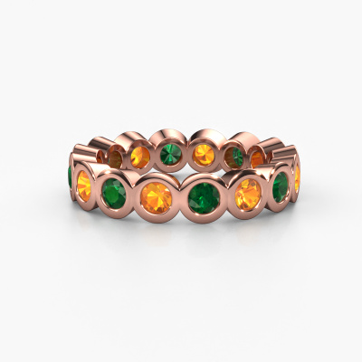 This is our Edwina 3 ring. This specific type is called an eternity ring and it is set with a continuous line of identically cut gemstones. The ring is made in 14 Carat rose gold and is set with small emeralds, 3 mm. The amazing emeralds are identical in size and are set in the ring band. Our emeralds are selected with great care so they are identical, which gives the best result. In order to get the best result, our artisans position all emeralds by hand with the utmost care. Our Goldsmiths have one ambition, which is creating the perfect ring. That is why we love what we do. In the end you get a stunning trendy rose gold stackable ring with a row of emeralds which seem to have no beginning nor end. The perfect symbol of your undying love for her! How special is that!After receiving your order, our goldsmiths will passionately start the creative process of making your ring in our own studio. Because we don't have a big stockpile, these costs will not be passed on to you. Our pricing is proof of that! We offer top quality jewels at lowest price, guaranteed.Our team of talented, passionate designers add new ring designs to our online collection daily. Our objective in doing so, is to be able to offer you a wide variety of jewels. Please feel free to request a quote if you have specific wishes for your ring. We guarantee to make you an offer you can't refuse.To make it easier for you, we offer a 30 day return policy. Check our terms and conditions.