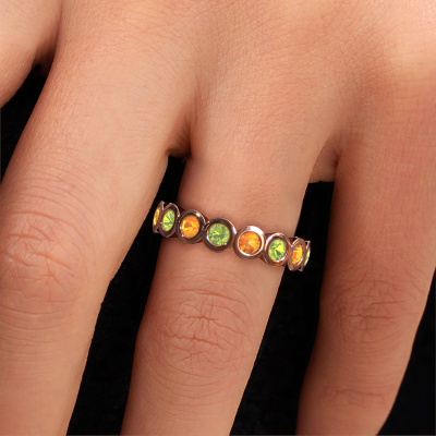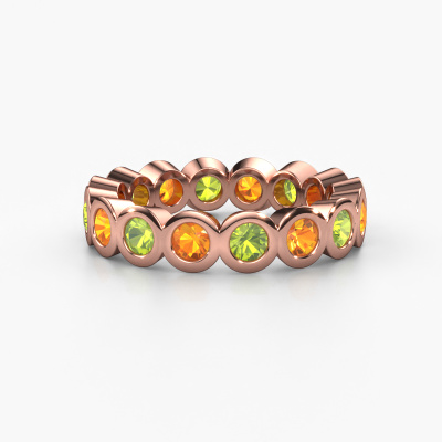 This is our Edwina 3 ring. This specific type is called an eternity ring and it is set with a continuous line of identically cut gemstones. The ring is made in 14 Carat rose gold and is set with small peridot, 3 mm. The amazing peridot are identical in size and are set in the ring band. Our peridot are selected with great care so they are identical, which gives the best result. In order to get the best result, our artisans position all peridot by hand with the utmost care. Our Goldsmiths have one ambition, which is creating the perfect ring. That is why we love what we do. In the end you get a stunning trendy rose gold stackable ring with a row of peridot which seem to have no beginning nor end. The perfect symbol of your undying love for her! How special is that!After receiving your order, our goldsmiths will passionately start the creative process of making your ring in our own studio. Because we don't have a big stockpile, these costs will not be passed on to you. Our pricing is proof of that! We offer top quality jewels at lowest price, guaranteed.Our team of talented, passionate designers add new ring designs to our online collection daily. Our objective in doing so, is to be able to offer you a wide variety of jewels. Please feel free to request a quote if you have specific wishes for your ring. We guarantee to make you an offer you can't refuse.To make it easier for you, we offer a 30 day return policy. Check our terms and conditions.
