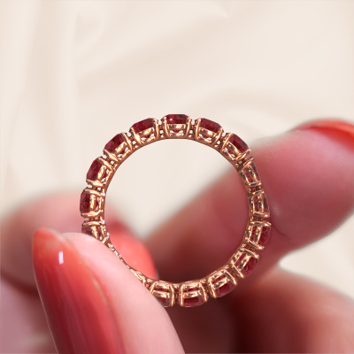 This is our Vivienne 3.7 ring. This specific type is called an eternity ring and it is set with a continuous line of identically cut gemstones. The ring is made in 14 Carat rose gold and is set with small ruby, 3.7 mm. The amazing ruby are identical in size and are set in the ring band. Our ruby are selected with great care so they are identical, which gives the best result. In order to get the best result, our artisans position all ruby by hand with the utmost care. Our Goldsmiths have one ambition, which is creating the perfect ring. That is why we love what we do. In the end you get a stunning classic rose gold stackable ring with a row of ruby which seem to have no beginning nor end. The perfect symbol of your undying love for her! How special is that!After receiving your order, our goldsmiths will start the creative process of making your Vivienne 3.7 ring. We don't keep stock. This is advantageous because these costs will not be passed on to you. Therefore, we can offer jewelry at exceptionally low prices.New jewelry designs are added to our online collection daily. Our team of passionate designers strive to create extraordinary and diverse designs. Have you seen a ring you like? Please feel free to contact us. Based on a good price/ quality ratio, we will make you an offer you can't refuse!To make it easier for you, we offer a 30 day return policy. Check our terms and conditions.